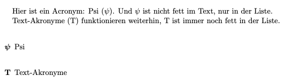 Man kann \documentclass[parskip=fill]{scrartcl} \usepackage{bm} \usepackage[hidelinks]{hyperref} \usepackage[printonlyused]{acronym} \renewcommand*{\aclabelfont}[1]{\bm{\textbf{\textrm{\acsfont{#1}}}}} \makeglossary \begin{document} Hier ist ein Acronym: \ac{psi}. Und \ac{psi} ist nicht fett im Text, nur in der Liste. \ac{t} funktionieren weiterhin, \ac{t} ist immer noch fett in der Liste. \bigskip \begin{acronym} \acro{psi}[$\psi$]{Psi} \acro{t}[T]{Text-Akronyme} \end{acronym} \end{document} |